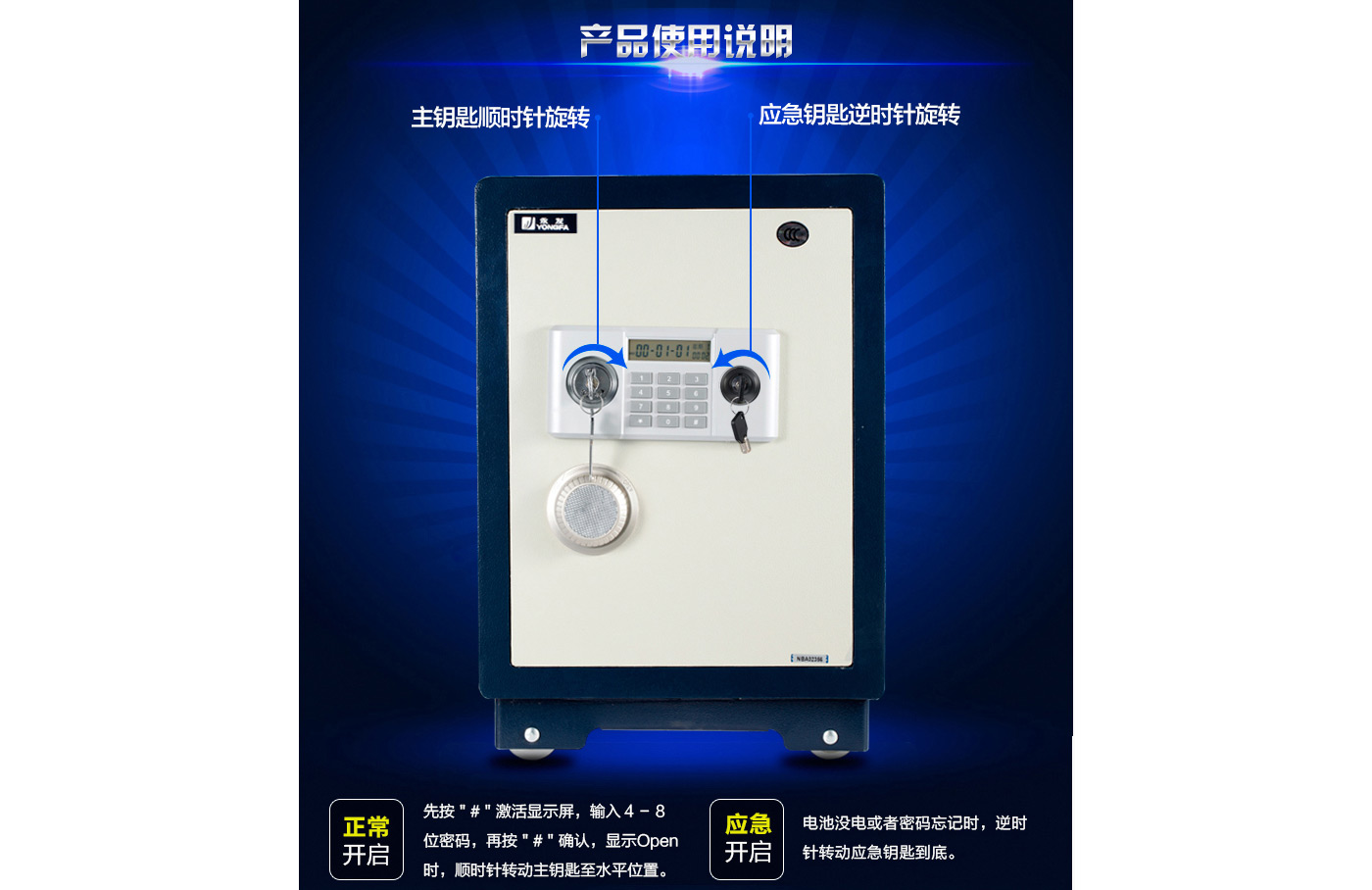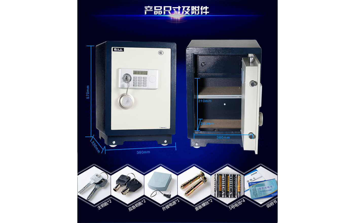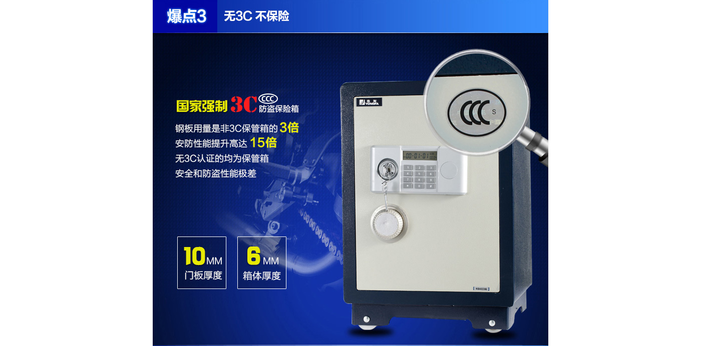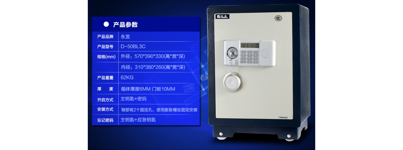 永發經典電子系列3C認證保險箱D-50BL3C尺寸說明:570高*390寬*330深mm(含底座) 重量:62kg