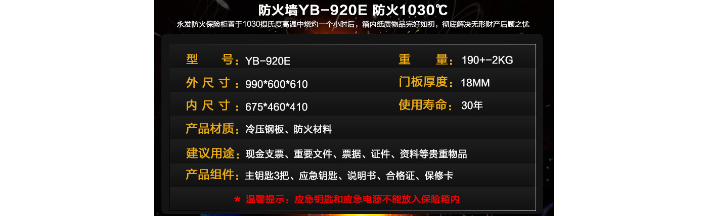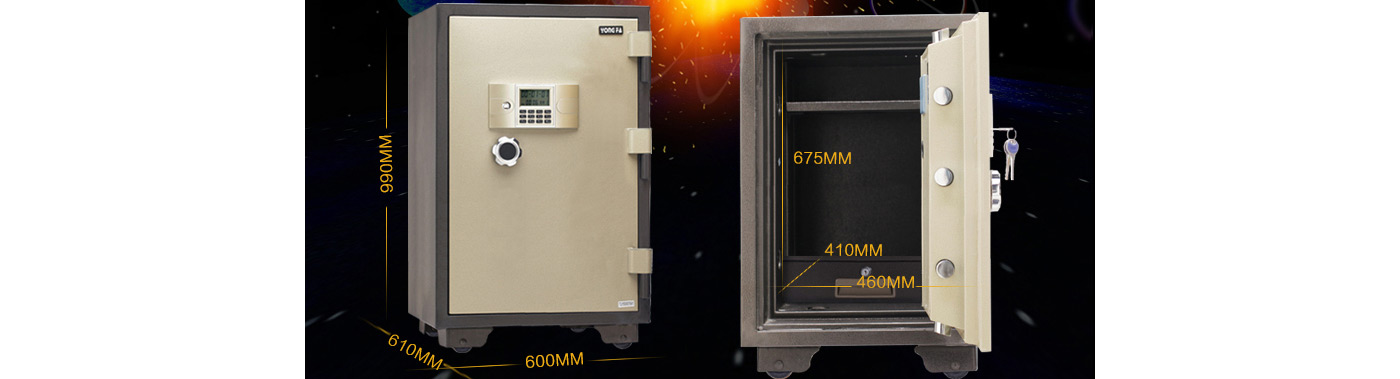 永發電子防火柜YB-920E尺寸說明:990高*600寬*610深mm(含底座) 重量:190kg