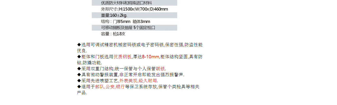 永發定制長槍柜尺寸說明:1500高*700寬*460深mm(含底座) 重量:160kg